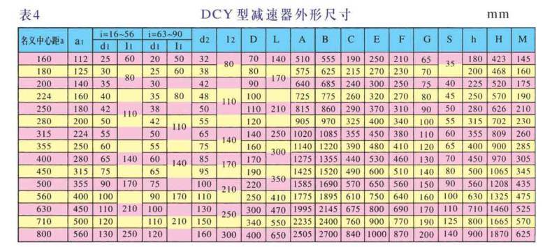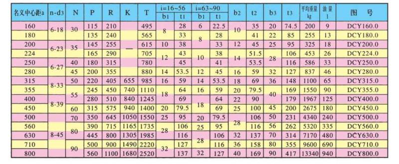 DCY、DCYK、DCZ型减速机各有15种规格,名义中心距为:160,180,200,224,250,280,315,355,400,450,500,560,630,710,800mm;每种规格均有11种传动比(16,18,20,22.4,25,28,31.5,35.5,40,45,50)两种旋向,四种装配型式,分别组成660种减速机。